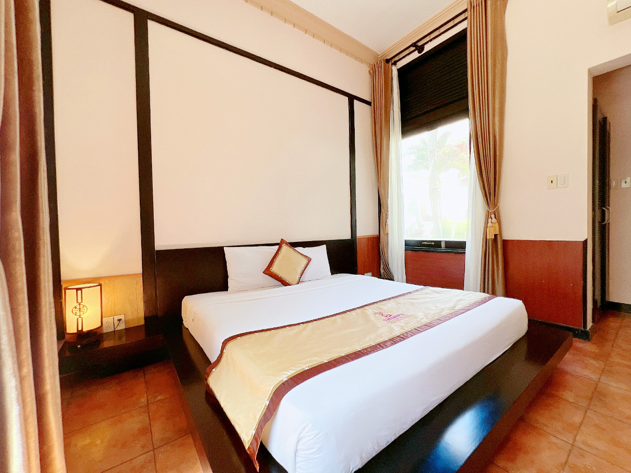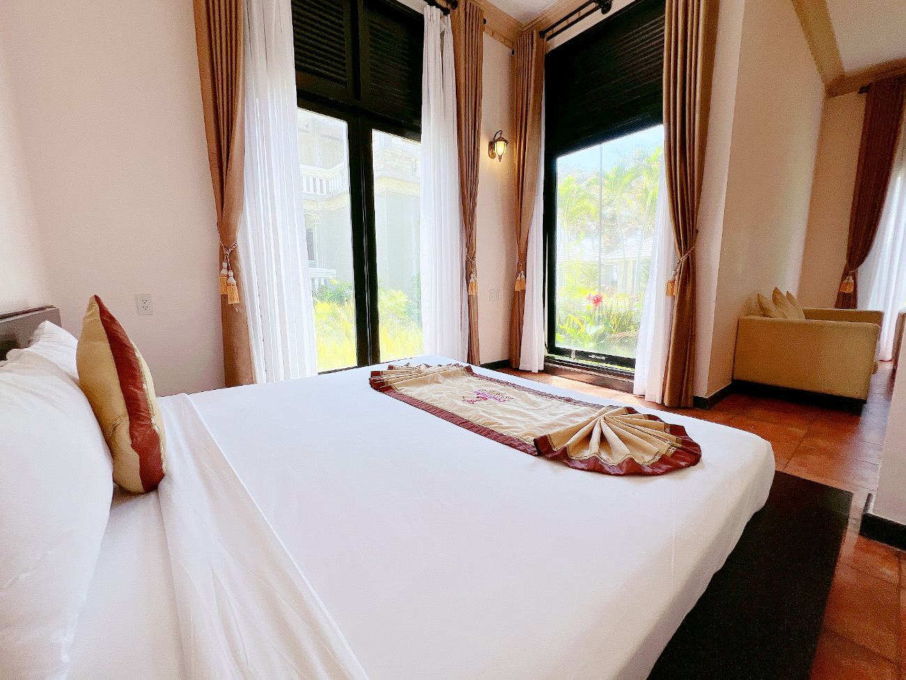 Mỗi phòng Villa có 01 giường lớn 2m rất thoải mái và trong phòng có bộ bàn ghế Sofa đẹp tiện lợi cho quý khách sinh hoạt. Phòng ngủ được trang bị đầy đủ: Máy điều hòa, điện thoại IDD, tủ và kệ hành lý, một bàn cà phê và ghế, giá treo áo khoác, báo khói, két sắt, TV màn hình LCD truy cập truyền hình myTV, mini bar, thiết bị cà phê và trà, tủ lạnh, bát trái cây, đèn chuẩn trong phòng, dép và truy cập internet, máy sấy tóc.....